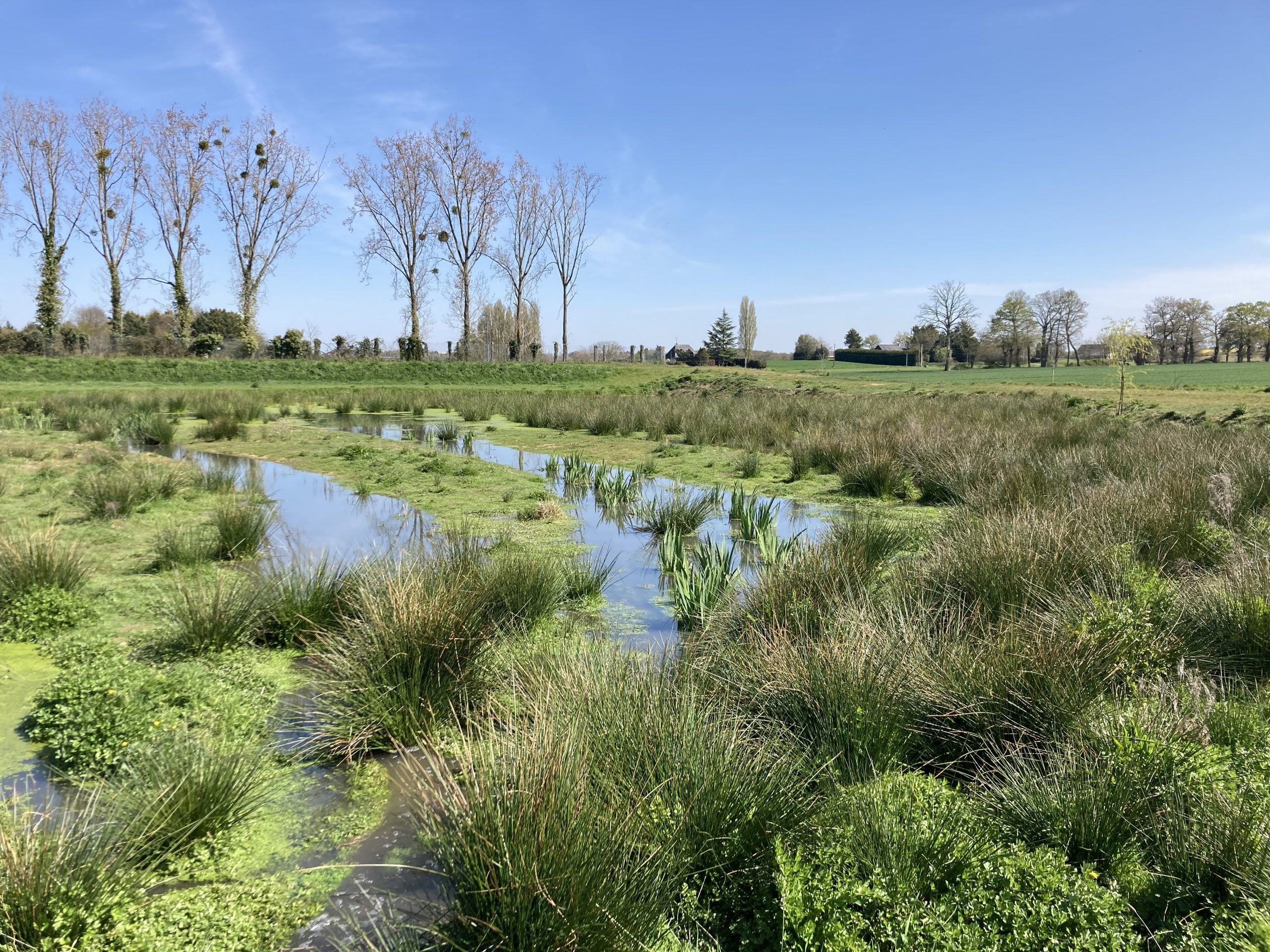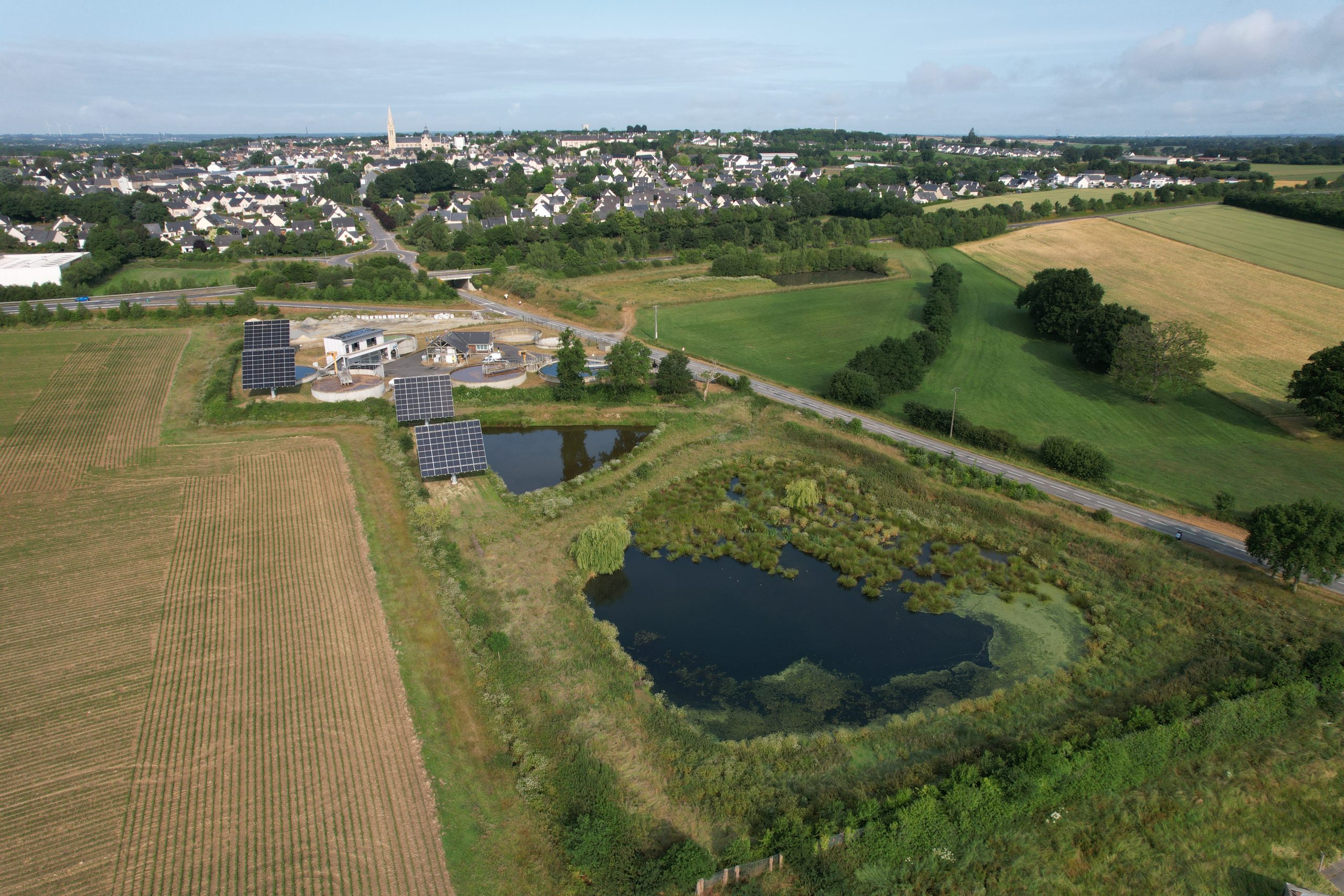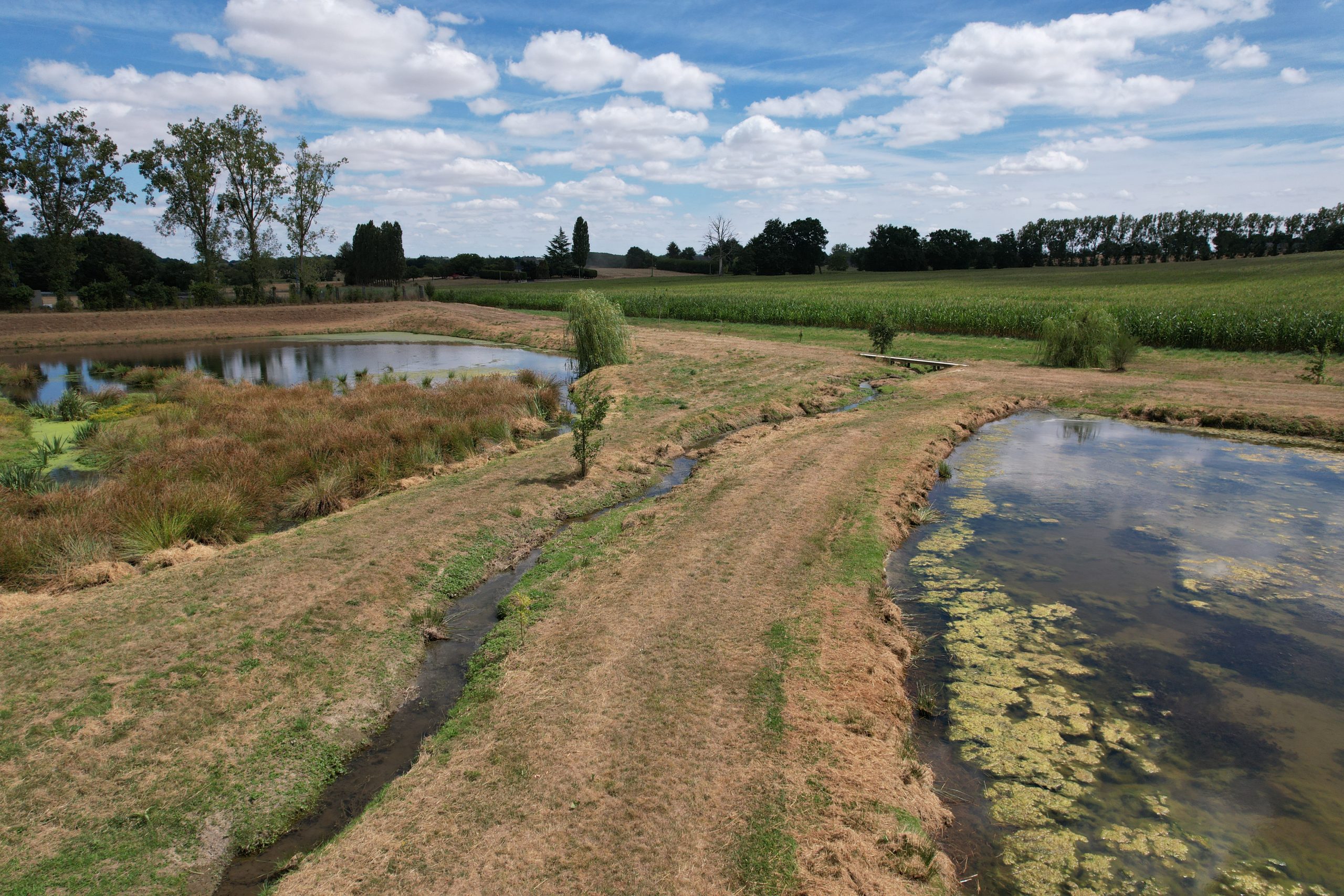 Aperçu en vol d'oiseau du ruisseau serpentant entre la zone de phytoépuration et le bassin de sécurité