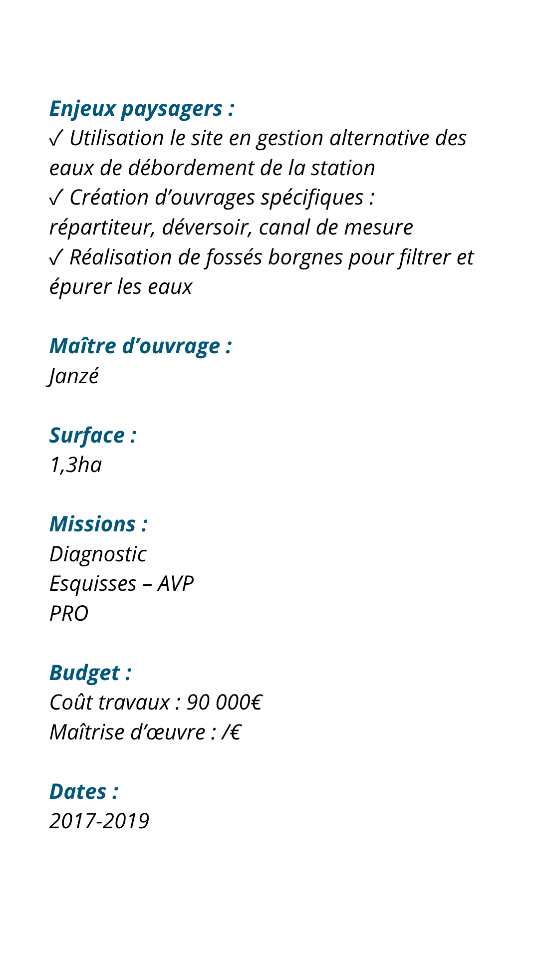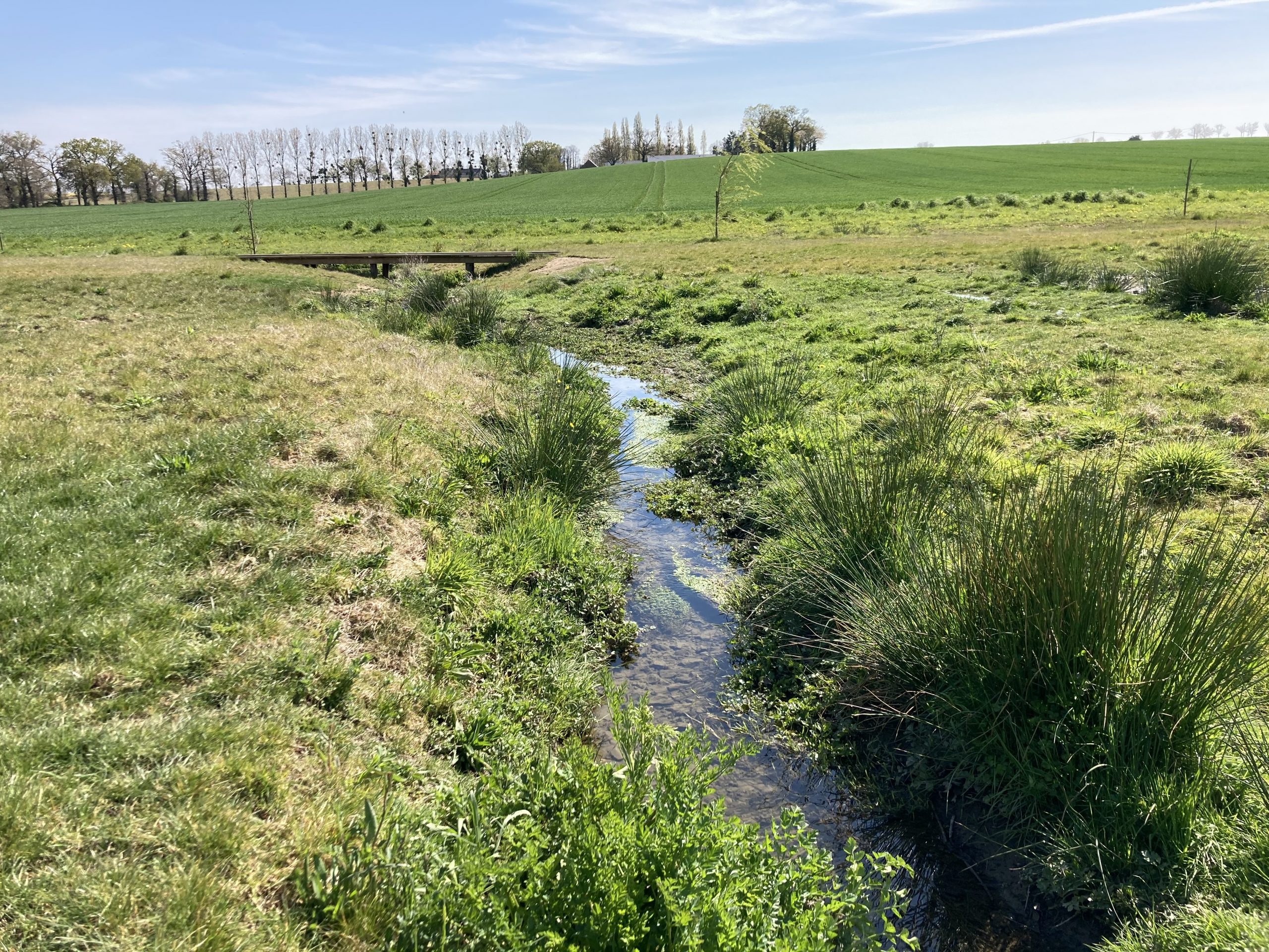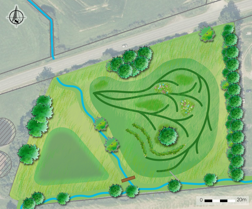 Aperçu en vol d'oiseau du ruisseau serpentant entre la zone de phytoépuration et le bassin de sécurité