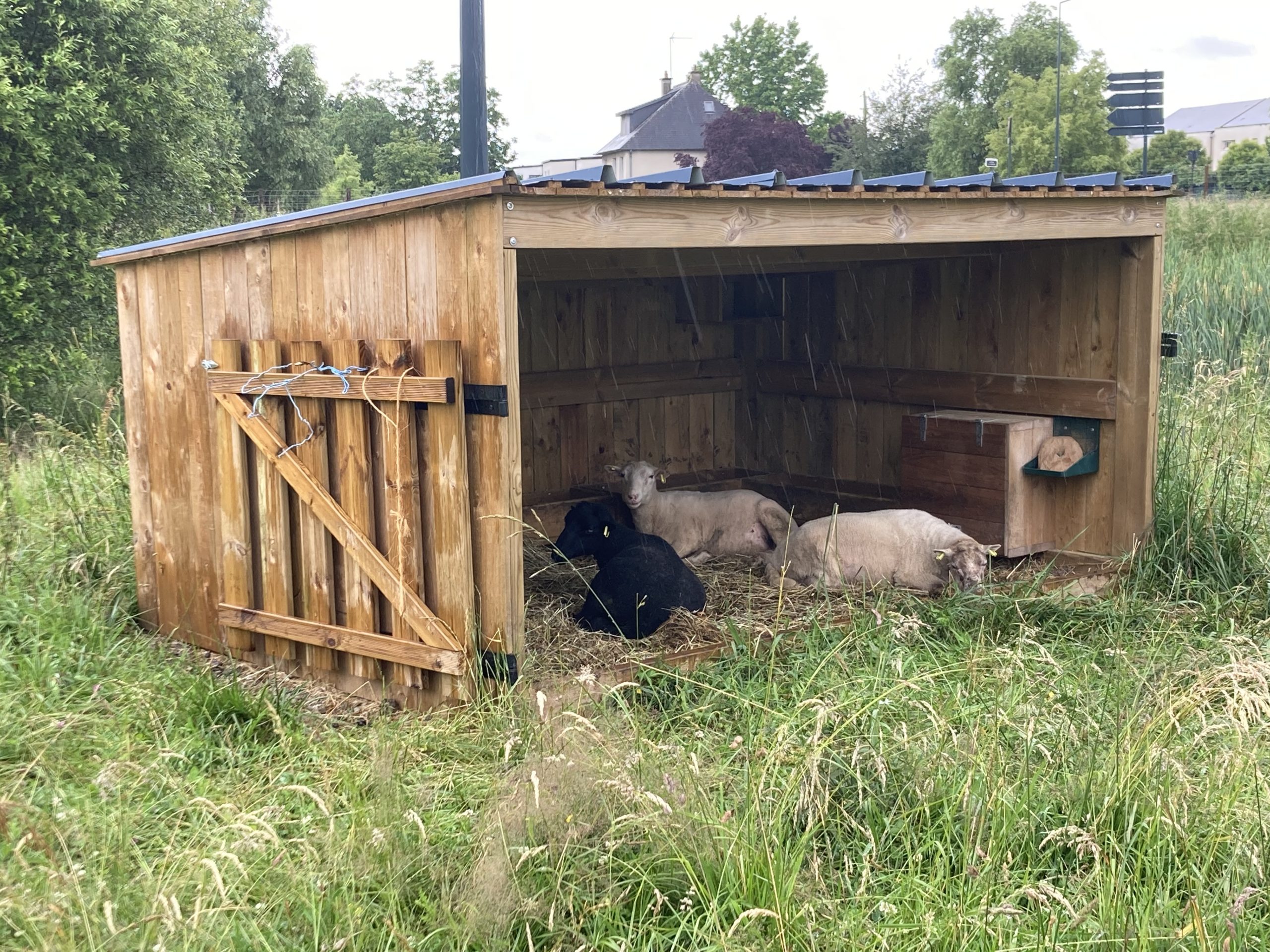 Abri à moutons dans l'un des bassins d'orage pâturés
