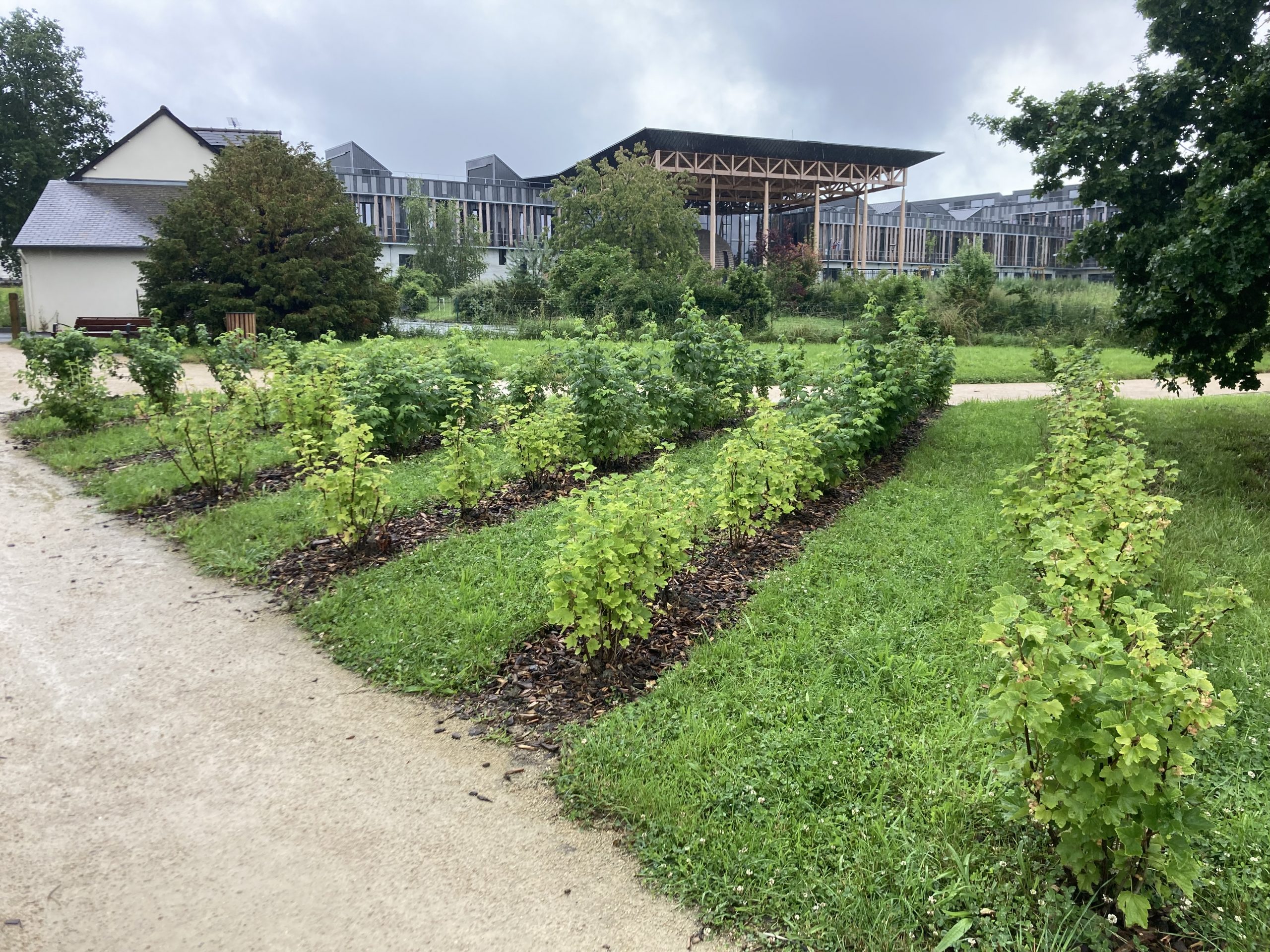Lignes de fruits rouges en bord d'allée avec le lycée en arrière plan