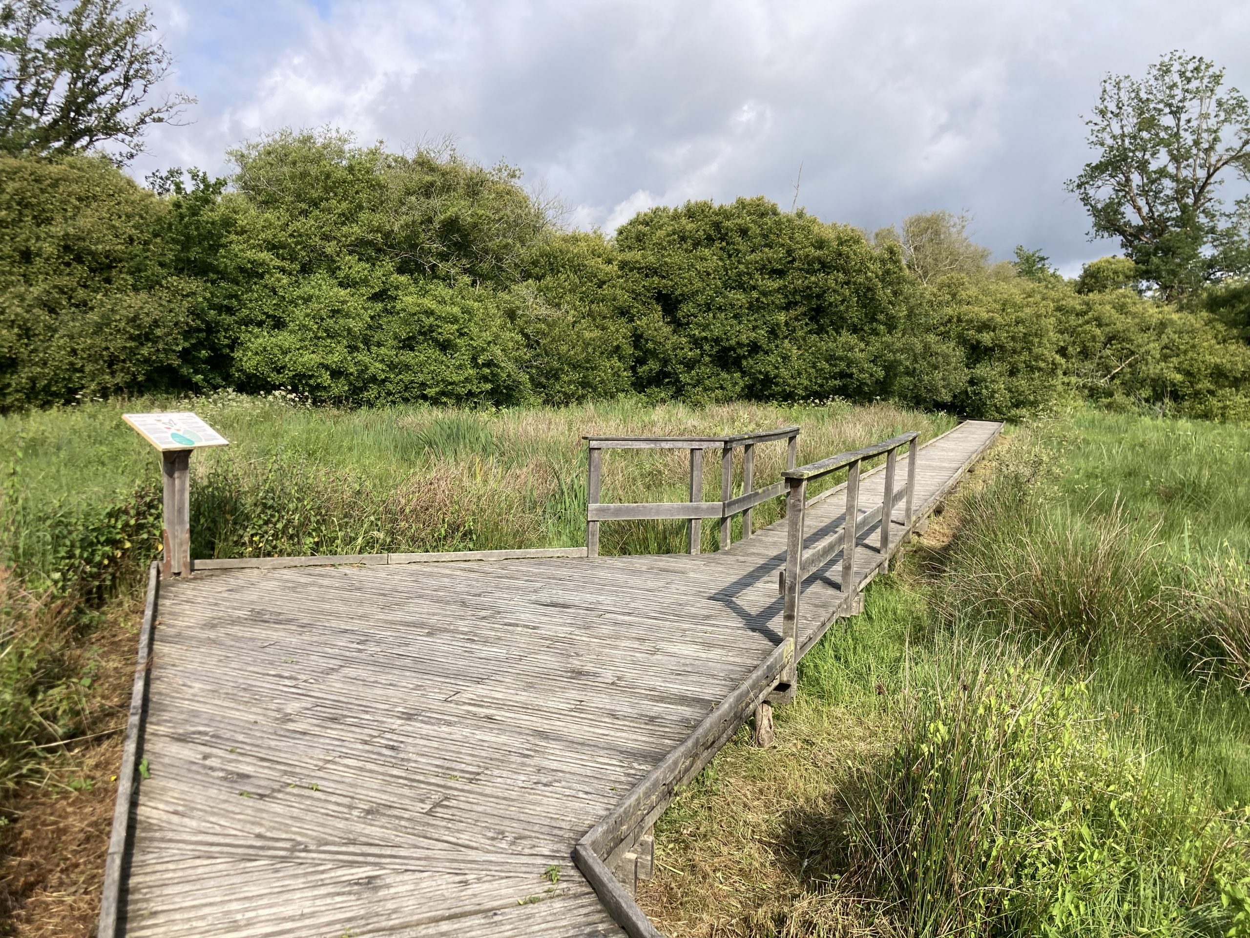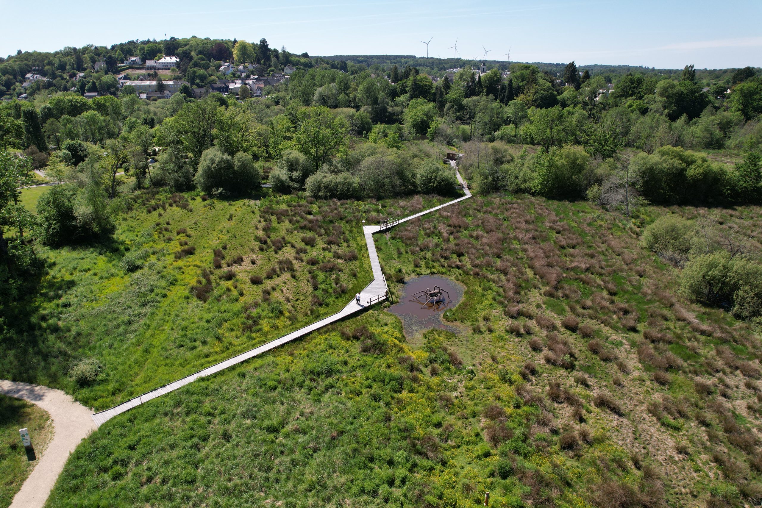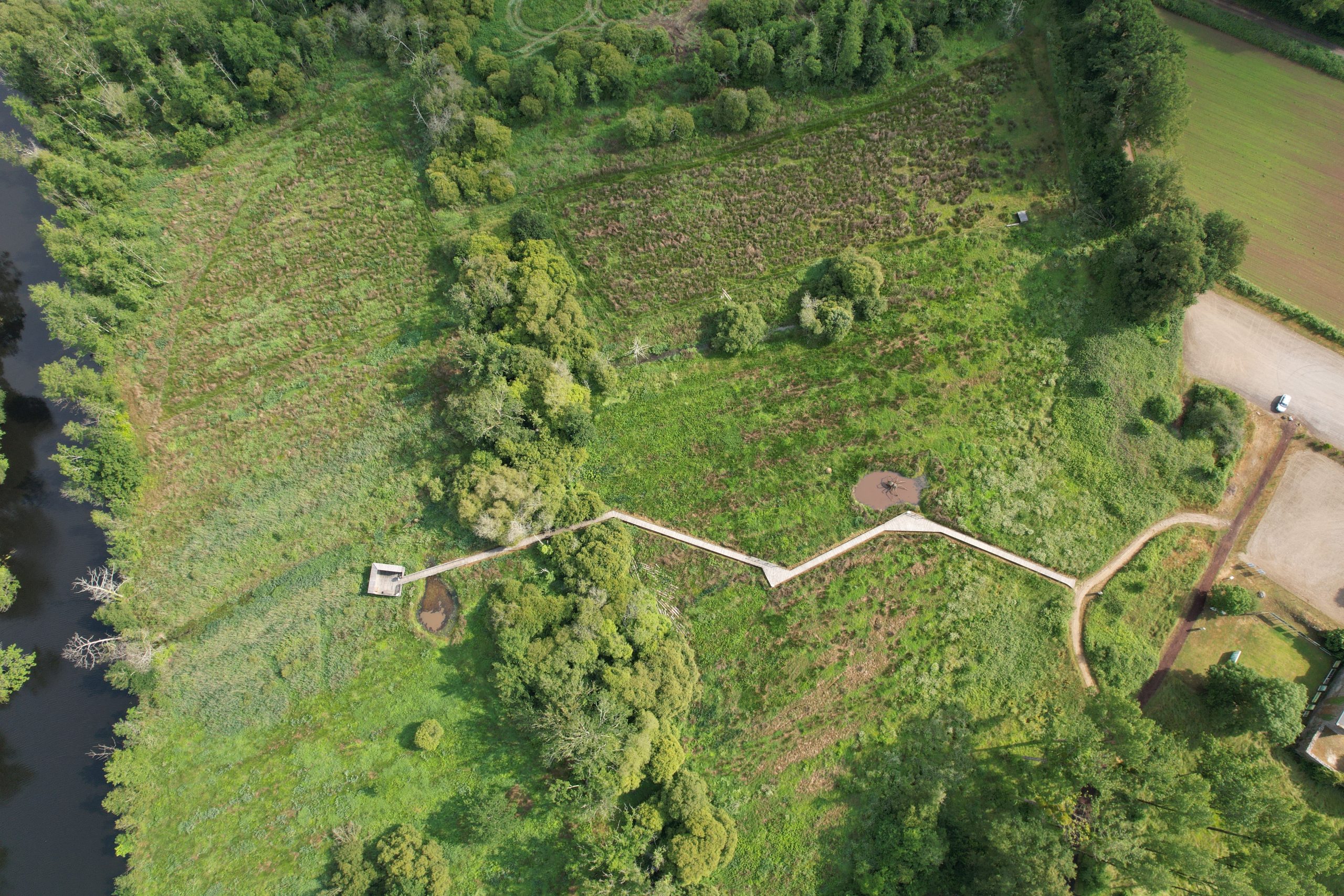 Vue en vol d'oiseau de la prairie humide avec le platelage vers l'Aff - Mai 2022